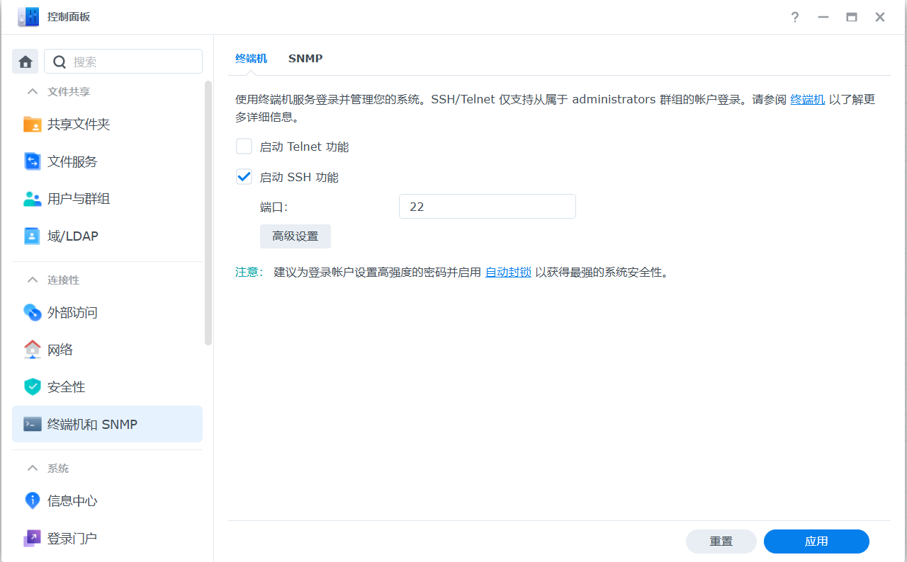 打开 控制面板 -> 终端机和 SNMP,勾选 启动 SSH 功能 并应用。
