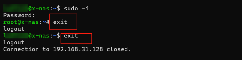 将所需的命令执行完毕后,可以在终端中输入 exit 退出登录。如果当前是 root 用户,则需要先输入 exit 退到普通用户,再输一次才能退出登录。