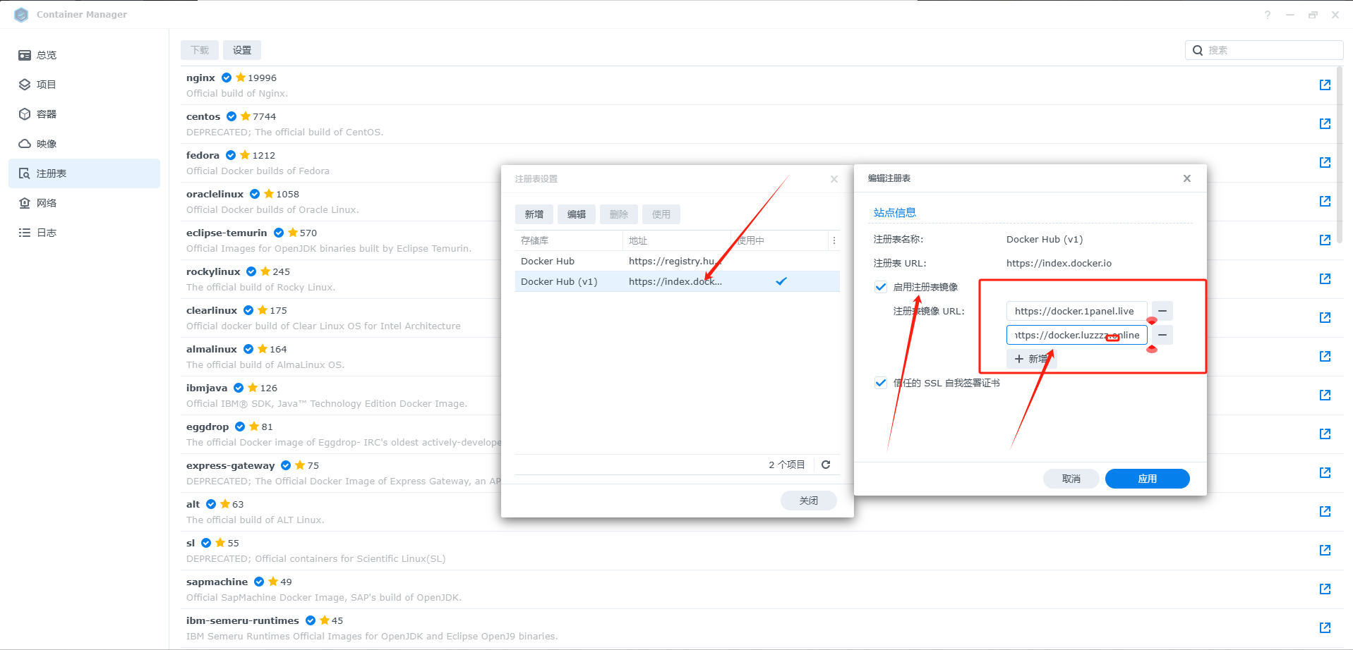 群晖Docker 注册表-设置 里面编辑 Docker Hub添加镜像,下载提升明显。(DSM7.2支持UI界面搜索、下载,DSM7.0、7.1只能ssh连接群晖使用docker pull下载)