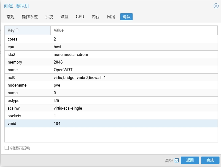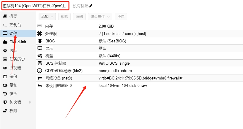 qm importdisk 104 /var/lib/vz/template/iso/bleachwrt-plus-20241119-x86-64-generic-squashfs-combined-efi.img local注意:命令的104是虚拟机编号,按自己的填写