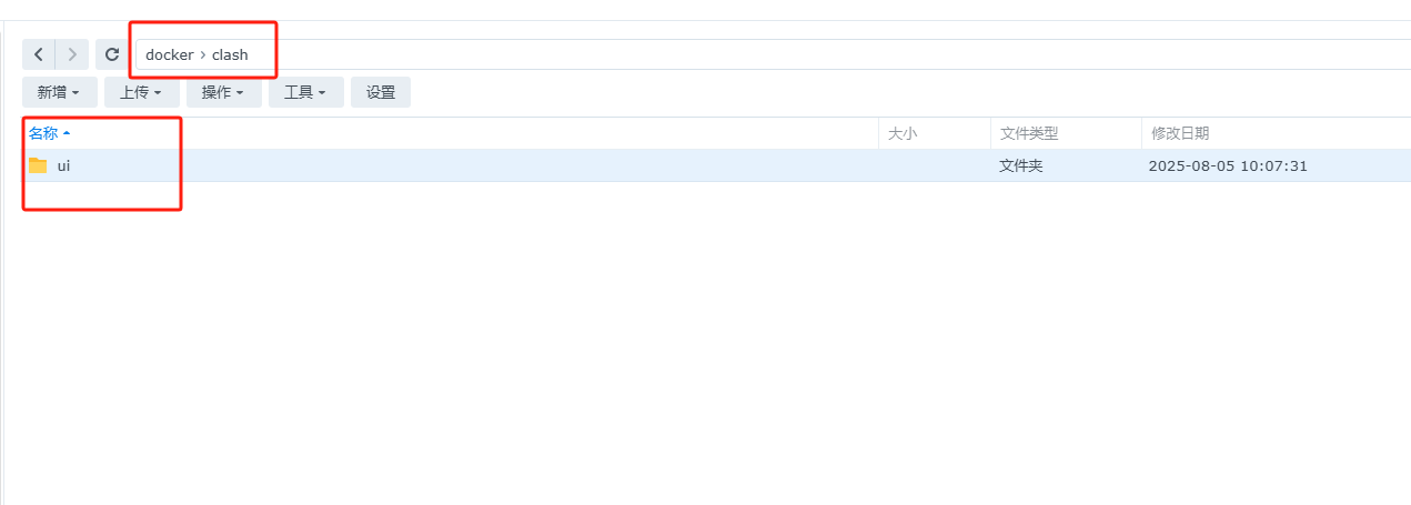 打开文件管理器,进入 docker 目录 创建一个文件夹存放clash需要的配置文件,我这里创建名为 clash,这个clash下再创建一个 ui 文件夹,如图