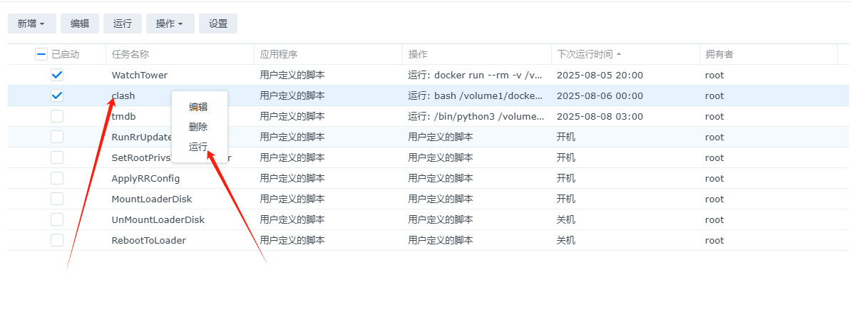 计划可以根据自己的更新需求,一天一次或者三天一次都可以,任务设置如下图,最后保存即可,注意 /volume1/docker/clash/reload-clash.sh 是之前的脚本路径