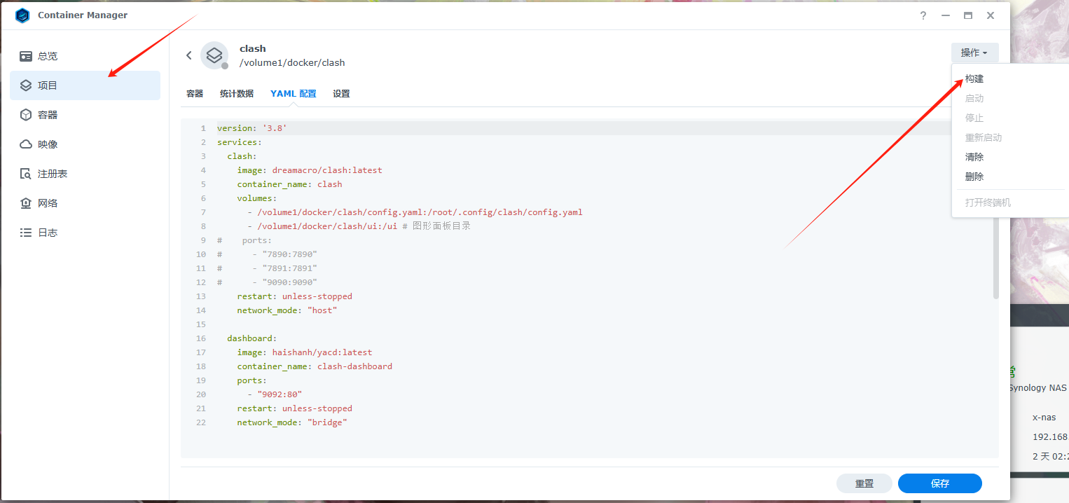 回到Container管理器,项目选项卡,点击构建,就会拉取镜像并创建两个容器,如果拉取不到镜像,那就是镜像地址不太行,群里问一问。