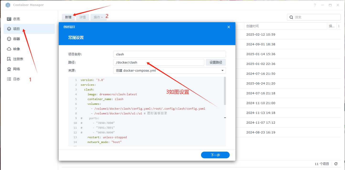 打开Container管理器,项目选项卡,点击新增,如图创建