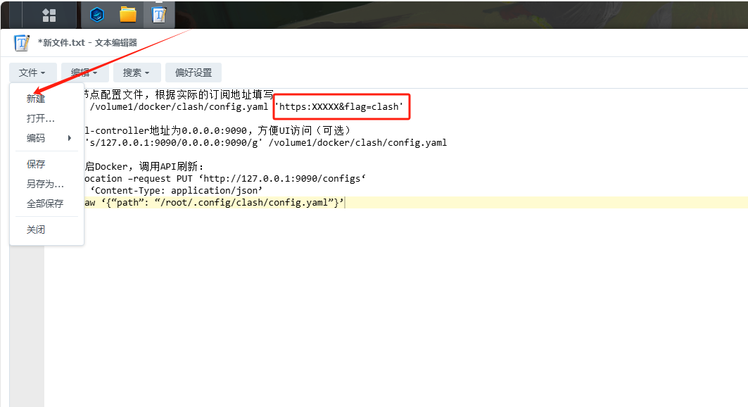 打开文本管理器,新建,写入如图,注意红框链接为自己的订阅地址,保存至之前新建的docker目录下,命名为 reload-clash.sh