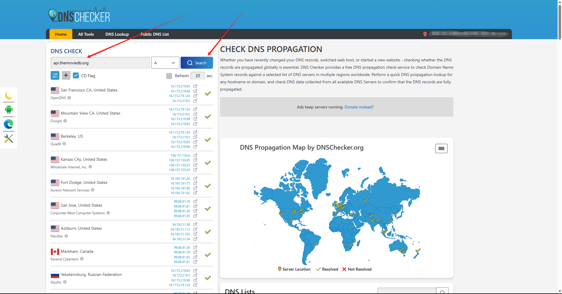 打开https://dnschecker.org,输入咱需要ping的网址,点搜索