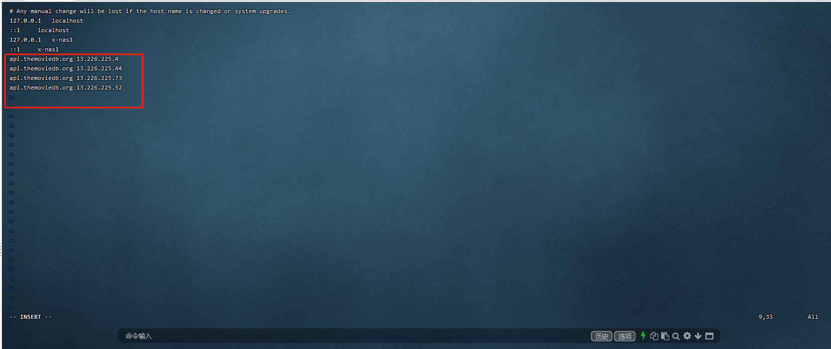 api.themoviedb.org 13.226.225.52如果还要其他地址的ip就重复上面的步骤,如法炮制,那么最后剩下的就是写入NAS,切换到root账户,编辑hosts文件
