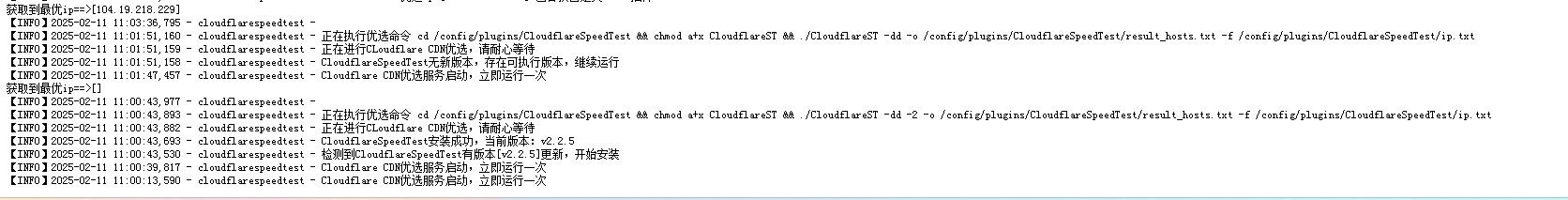保存后插件聚会自动执行,我们查看日志,如下图就成功了,此时 自定义hosts插件 内的IP会变动,这个就是咱们优选出来的IP,快去站点管理进行连通性测试吧。