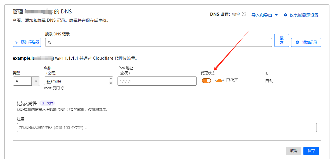 使用Cloudflare优选IP的首先条件是目标站点使用了Cloudflare作为代理,也就是将域名挂到Cloudflare上后添加DNS解析时开起来小黄云代理,意思就是当别人访问该域名是返回的是Cloudflare服务器的IP而不是你自己服务器的真实IP,这样子就可以达到隐藏自己真实IP,保护自己的目的,如下图这样:
