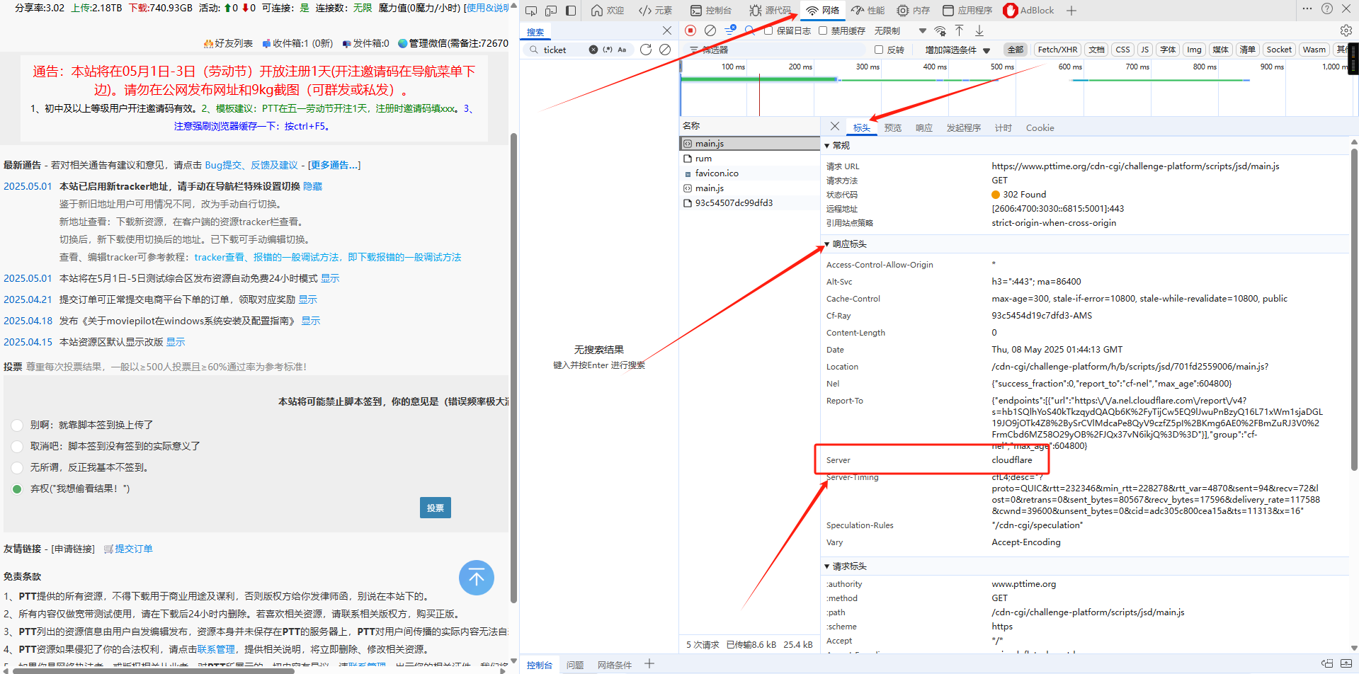 当然,我们作为用户肯定是看不到这些管理页面的,以上只是解释一下大概原理。想知道目标站点是否使用了Cloudflare作为代理很简单,任意打开一个站点,打开控制台切换至 网络/network 选项,保证筛选器选择的是 全部,刷新网页,在 网络/network 选项翻到第一个请求,找到 响应标头/Response Header,在里面找 server,如果 server 是 cloudflare,则代表该域名可以被优选IP。以某站示例:
